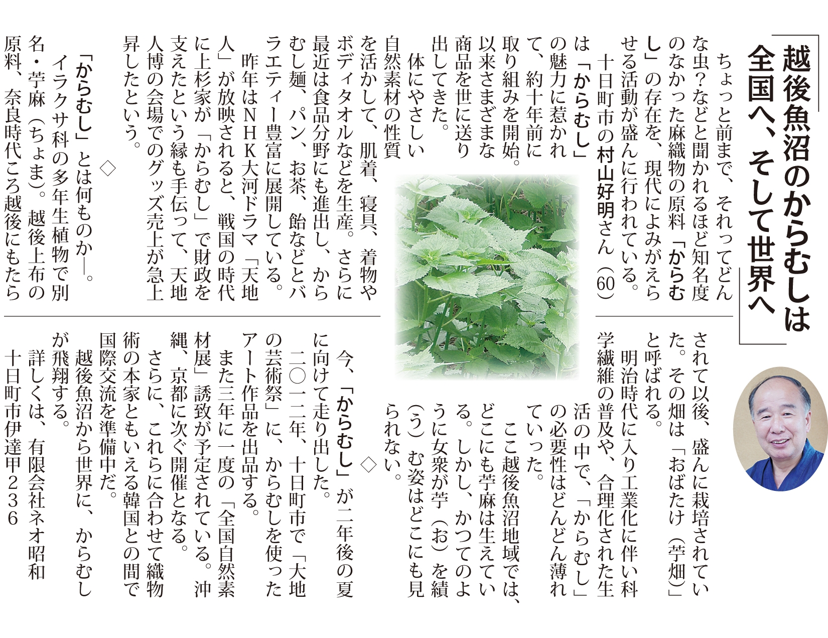 - 6月18日の上越タイムスにからむしについての記事が掲載されました。