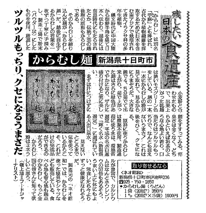 - 2013年4月4日 日刊ゲンダイ「残したい日本の食遺産」に当社の「からむし麺」が紹介されました。