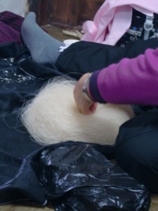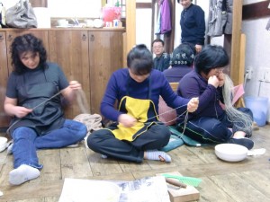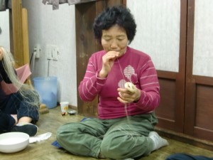 別棟に入るとそこは「手績み」の作業をしていました。お名前は聞いたのですが韓国の重要無形文化財の方です。見えないような糸を作っていますね、と話したらここの手績み作業をしている人たちは皆目がいいので細い糸が作れる、と語ってくれました。皆さん本当に親切な方ばかりです。研修生もいらっしゃいます。