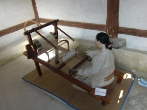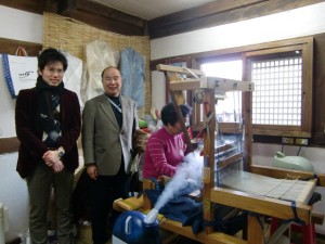 機織りも見学しました。韓国では幅が32センチ、長さが21.6メートルの反物です。これが高級チマチョゴリになるのだそうです。湿気を当てながら織り続けます。