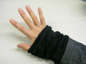 ところが「からむしアームカバー」はもともと日焼け防止用で長さが55㎝と長く冬には使いにくいということで画像のようにオシャレな着用でお使いになっていらっしゃいます。