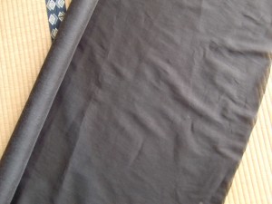 また次の生地は庭野政義さんに「柿渋」と「化学染料」それぞれ50パーセントずつで染めて頂いた広幅の生地です。