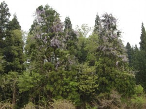 また近くの杉の木に絡み付いた山藤の花が今を盛りと咲き誇っています。
