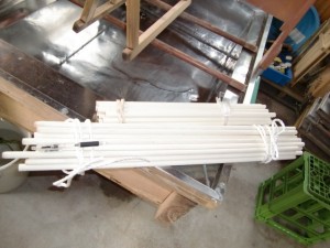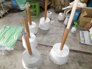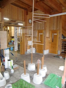 下の写真の円錐状になっている細い棒にからむし染め生地を吊るそうと考えました。