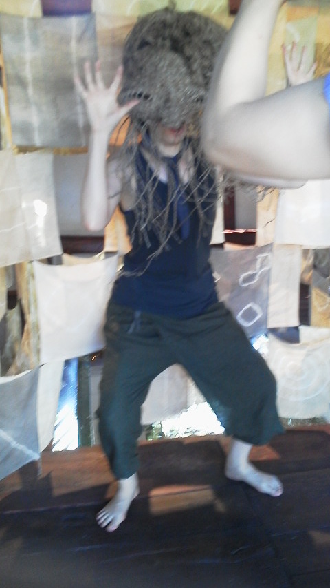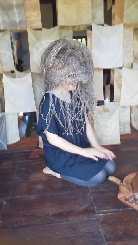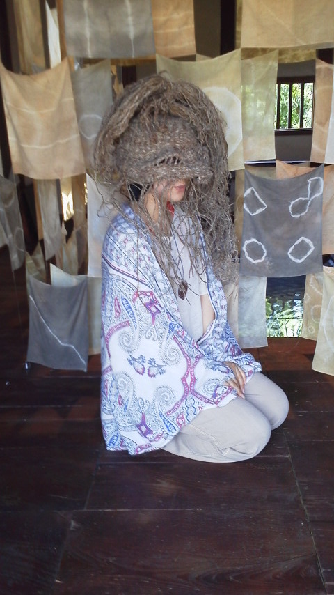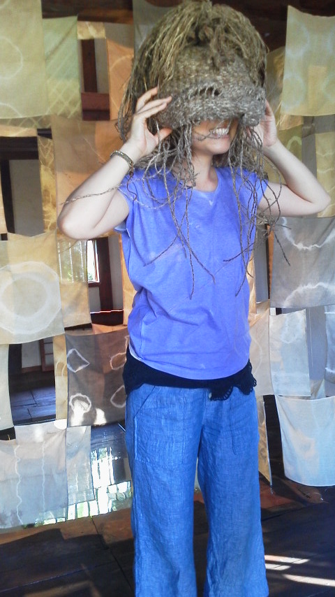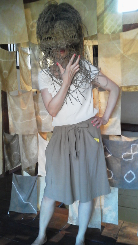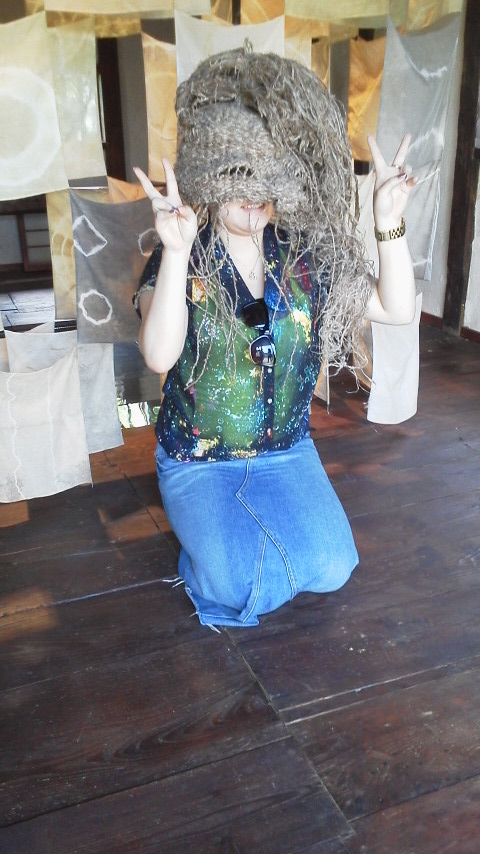 きょうも山本あまよかしむさん手作りの「からむし面」をお客様にかぶって頂きました。