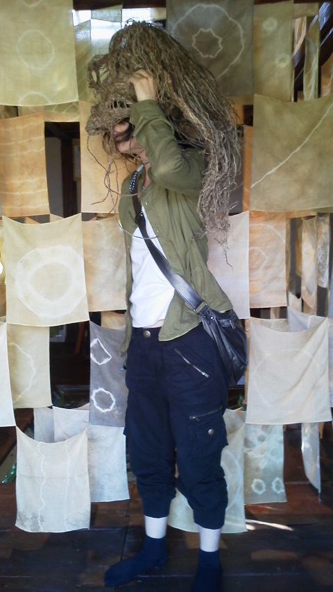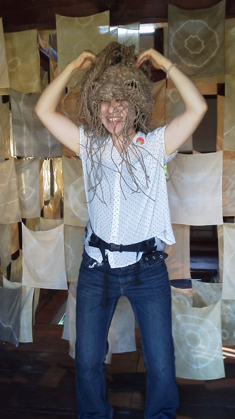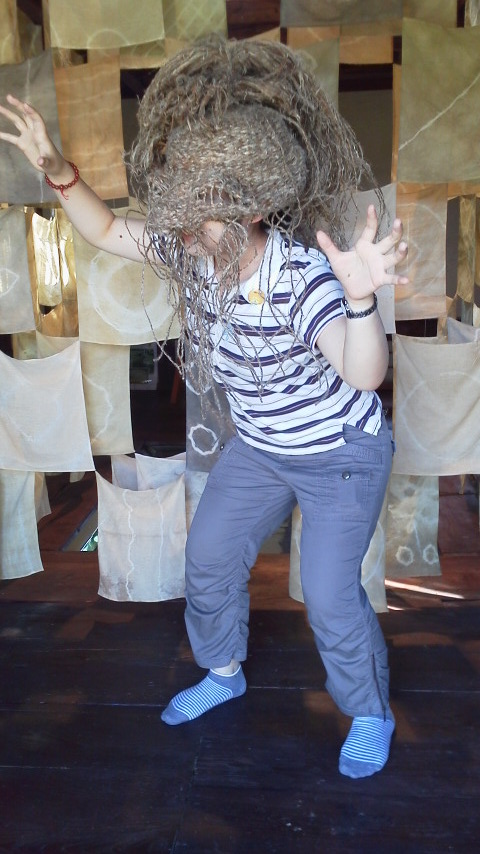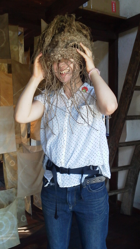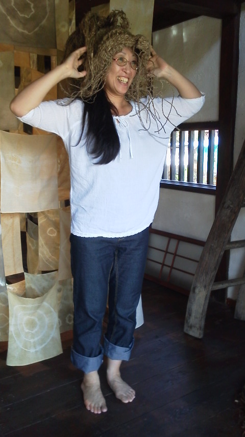 山本あまよかしむさん手作りの「からむし面」をかぶって撮影しました。